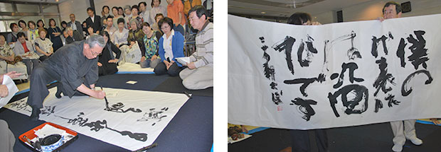 先生の番になり2枚目の揮毫で「あかんなぁ~、もう1枚書かしてもうてもええですか?」の問いに会場にも笑いが…。